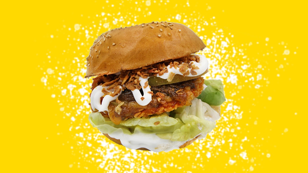 Crispy Tender ai Corn Flakes 100% Vegetale*, Orange Cheddar, Insalata, Cetriolini e salsa ai 3 Pepi - 11€